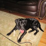 Carola just finished her late afternoon walk and off the leash playtime in the backyard. Now, she is relaxing with her rawhide and just hanging out.