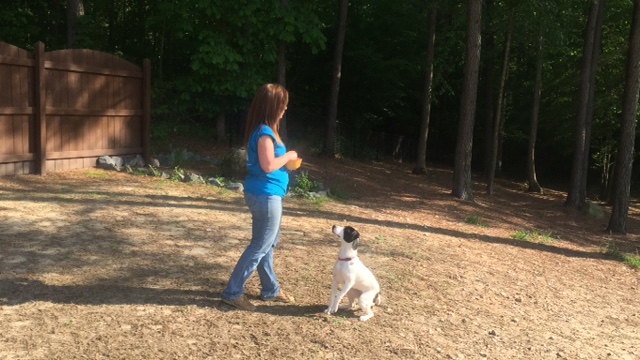 Izzy needs to keep that nose busy. To satisfy her hunting side and to keep her in the yard, sometimes I throw handfuls of food on the ground. She finds every tiny piece! I also use dinner time to practice “COME.” I wait until she gets distracted by a bird, kid, or another dog and then I call her over and make her “SIT” for another handful of food. Look at that focus!