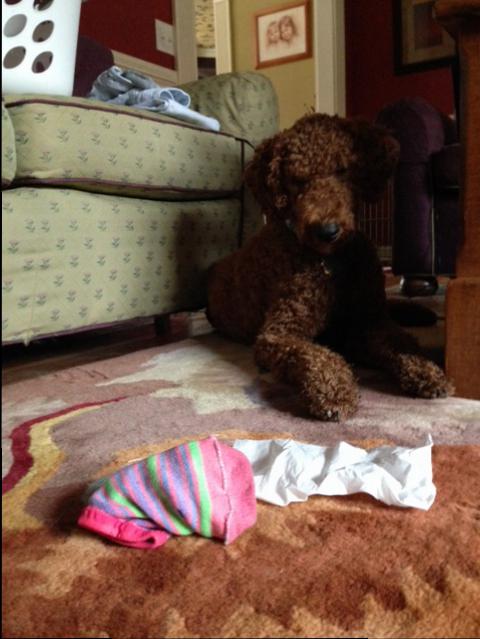 Sadie likes toilet paper & smelly socks. Today she is learning that I own everything in this house. She has to “Leave It” no matter where she finds it. Taking these items away from her doesn’t teach her a lesson. Instead, she has to learn to back up and leave them alone. Maybe I’ll teach her to throw them away!