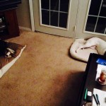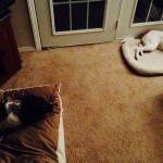 After a long day of work and play it is time for everyone to settle in their own spot. Using a pet bed helps the dog know where you want them to settle and giving them a bone, antler, or other good chewie will give them something to keep busy. Good job Bernie and Sully!