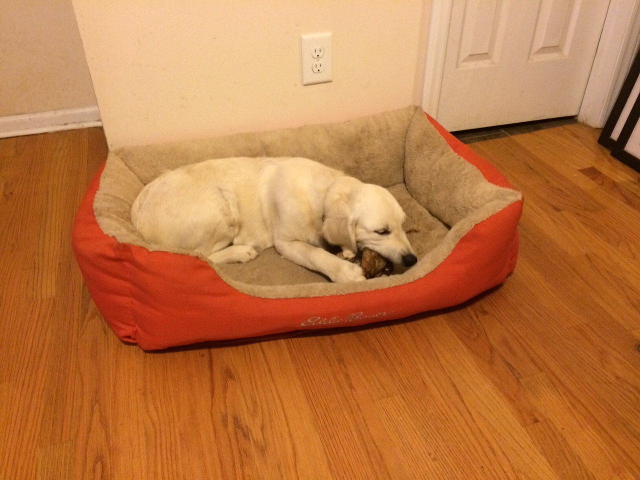 Oakley is learning to settle down inside while I do chores around the house. She stays busy with a yummy knuckle bone instead of following me around. Giving her something to work on makes things easier because she isn’t looking for something to chew. If she gets off her bed, I lead her right back to it. Good job Oakley!