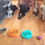 Rudy, Leo, Stella, and Willie know that dinner time means everyone is calm and patient, and I control all meals. They can stay in a SIT or a DOWN while I make everyone’s food, and no jumping forward while I put bowls down. For the fast eaters, putting their food into slow feeder bowls, like Leo and Stella’s, slows them down and challenges them to get their food. Willie is using a Busy Buddy that throws out a few pieces at a time as he rolls it around. This keeps him busy for a long time so that he can’t gobble all his food up in 2 bites!