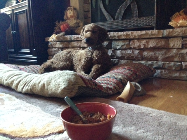 Somebody likes Raisin Bran! I left it on the coffee table to answer the phone! When they do something you don’t like, it’s a perfect teaching opportunity! I backed Sadie up with my body to claim my food bowl. Then to further challenge her, I put it on the floor. A dog completely understands this concept of waiting for permission from the pack leader to eat anything. The “SIT for meals” leadership exercise is the same thing, except in this case Sadie is never released to eat my breakfast!