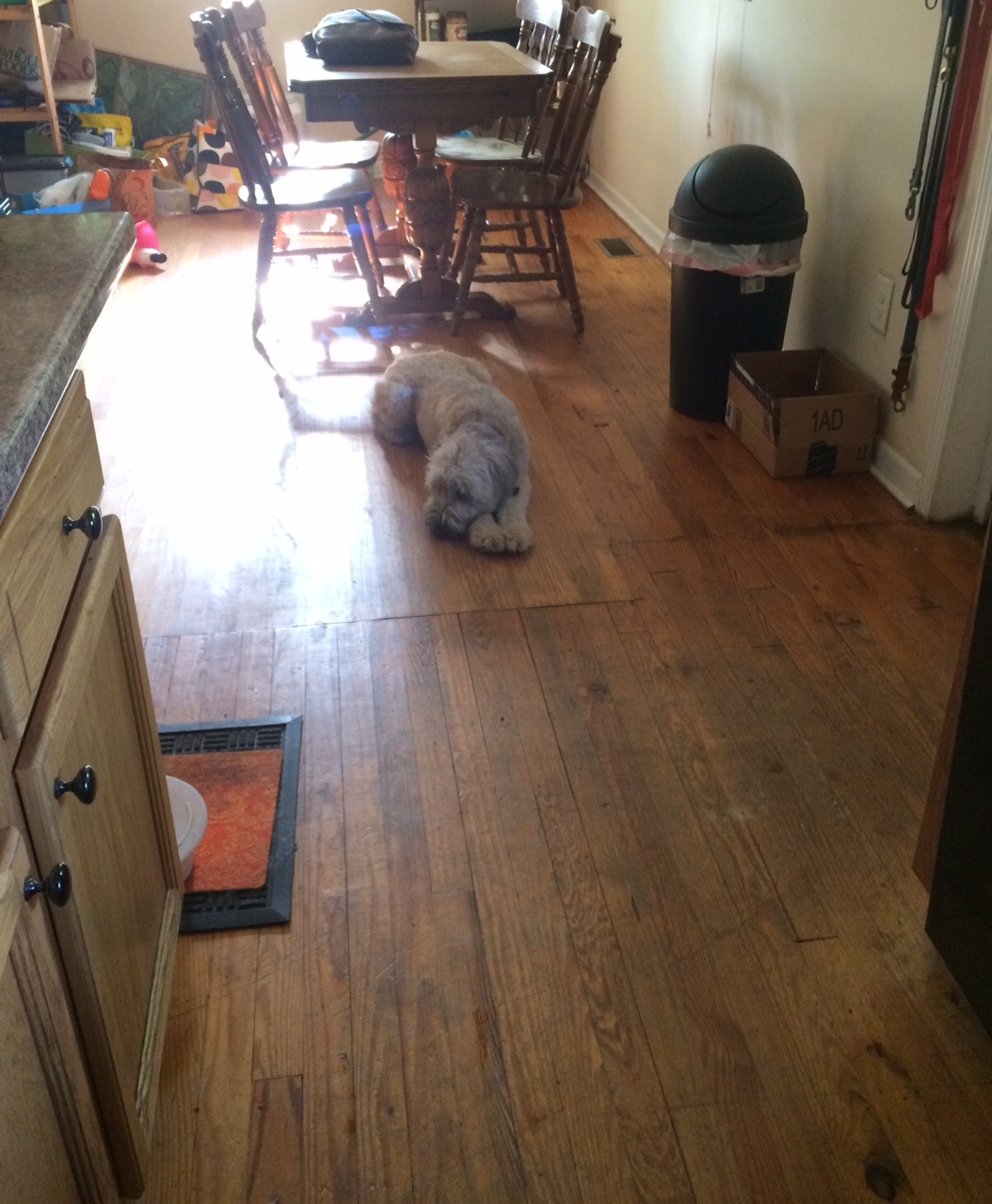 When I’m in the kitchen, Rosie has to respect my space and wait outside of it. If she steps forward, I back her away with my body. This works in any off limits area of the house, and builds confidence so she sees she doesn’t have to be right with me all the time. She can do whatever she wants as long as she doesn’t step into the kitchen. Relaxing is a nice choice!