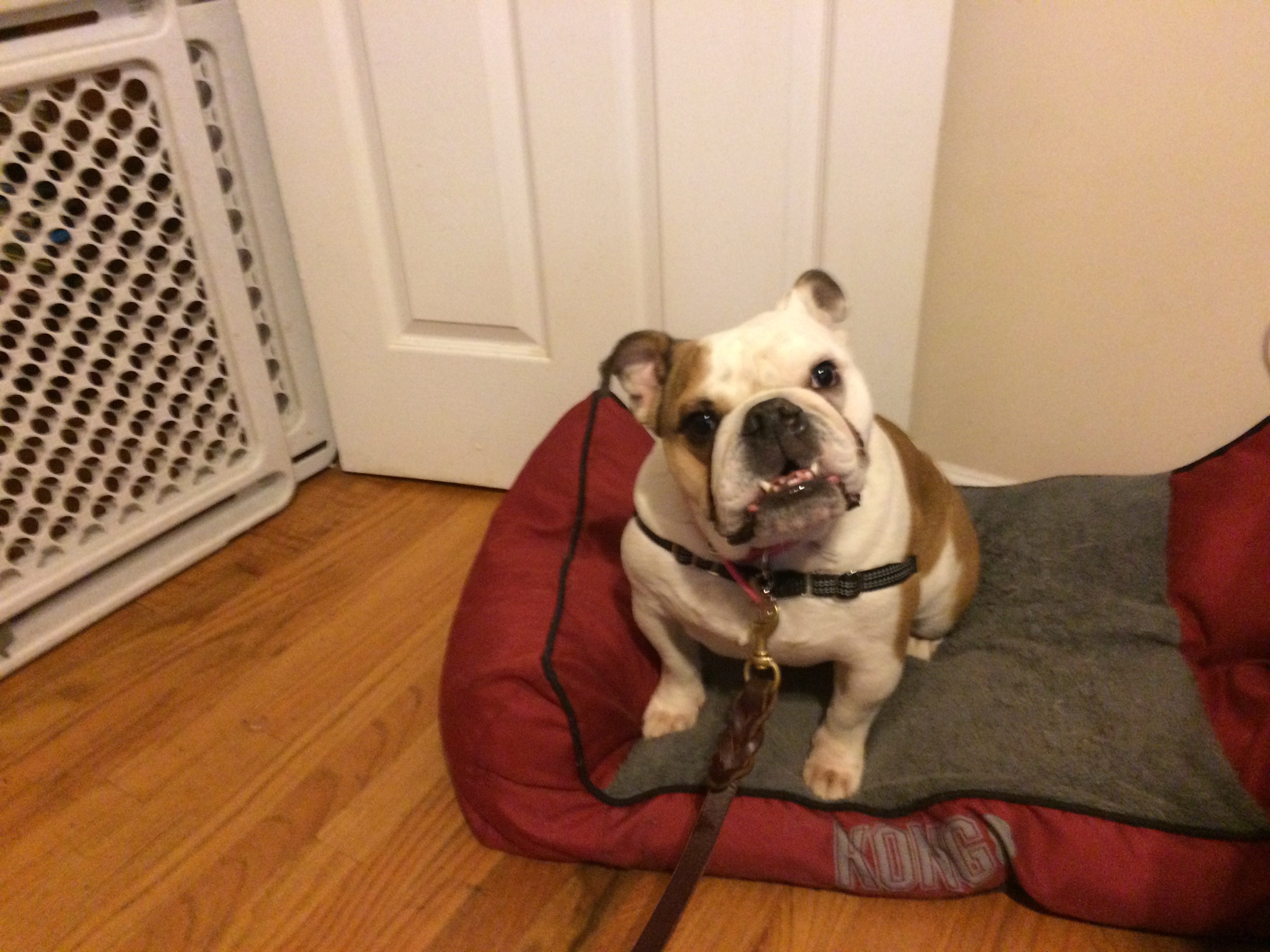 Sadie is working on staying on her bed to settle down instead of zooming over the furniture and getting in my space. She’s wearing a leash for now so I can easily step on it and lead her back when she gets up. This keeps it from becoming a game of chase. I kick my feet back and work at the computer, telling her “eh eh” and putting her back on her bed the moment her paw touches the floor. Eventually she won’t need the leash and we can work from greater distances, but for now we start small with her right beside me. Good job Sadie!